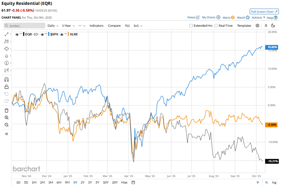 EQR stock has declined 14.7% over the past 52 weeks, underperforming the broader S&P 500 Index's ($SPX) 16.3% gain and the Real Estate Select Sector SPDR Fund's (XLRE) 5.1% decrease over the same time frame.