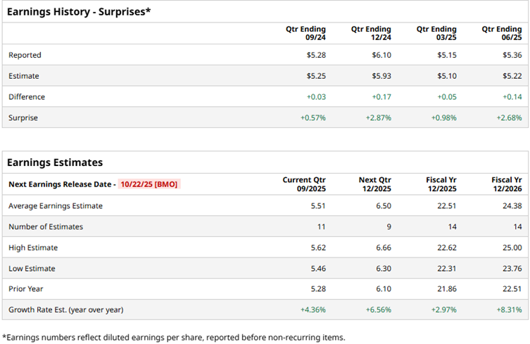Thermo Fisher is set to report its third-quarter results for fiscal 2025 on Oct. 22, 2025, before the market opens. Ahead of the results, Wall Street analysts are expecting modest increases in its bottom line. For the third quarter, its profit is expected to be $5.51 per diluted share, up 4.4% year over year (YOY). The company has a solid history of surpassing consensus estimates, topping them in all four trailing quarters.