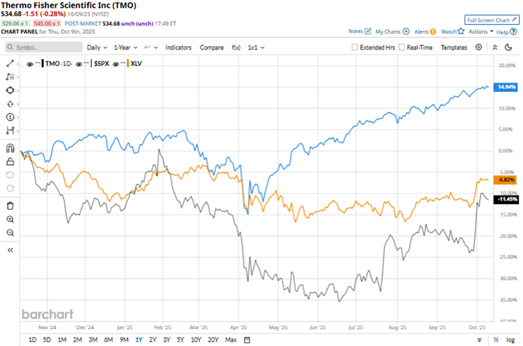 Thermo Fisher’s stock has been underperforming the broader market over the past year. Over the past 52 weeks, the stock has declined 10.8%, while it has gained 2.8% year-to-date (YTD). On the other hand, the broader S&P 500 Index ($SPX) has gained 16.3% and 14.5% over the same periods, respectively.